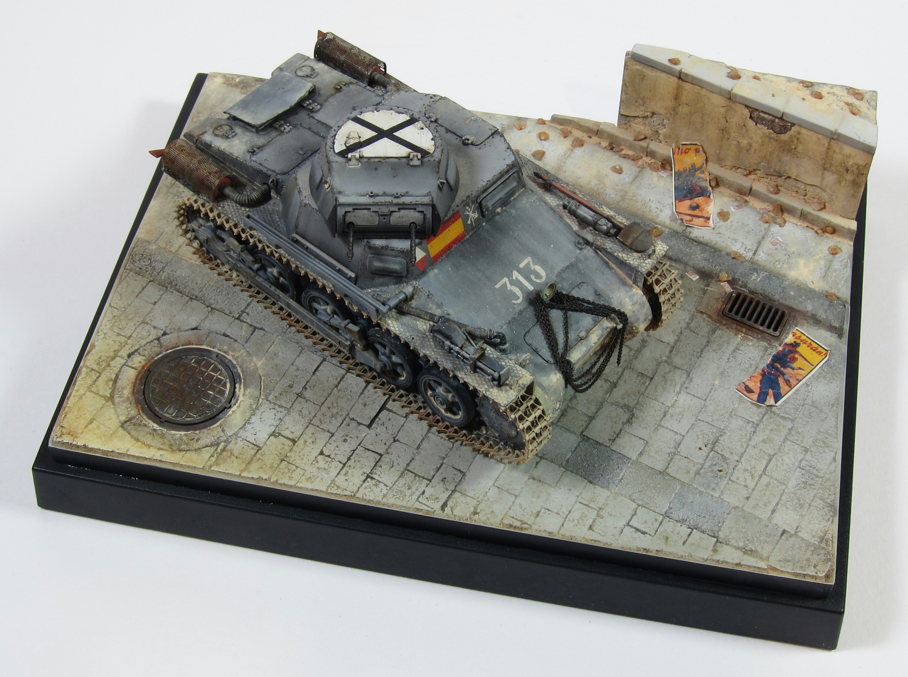 Mr. Quijano is up to his usual outstanding level of work with this exciting piece which features Tamiya’s kit modified to represent a wrecked and abandoned beast that has come to rest in an unusual and dynamic attitude. The model is heavily weathered but in away that doesn’t seem out of line with the vehicles disposition. The addition of some simple scratchbuilt elements enhance the kit details and some creative styrene work replicates the shattered plate steel and mangled barrell of the wretched beast. The finish has a depth that astounds (in my opinion the characteristic feature of the style known as “The Spanish School”) A well executed base brings it all together and displays the model in an attractive fashion.